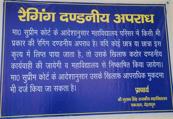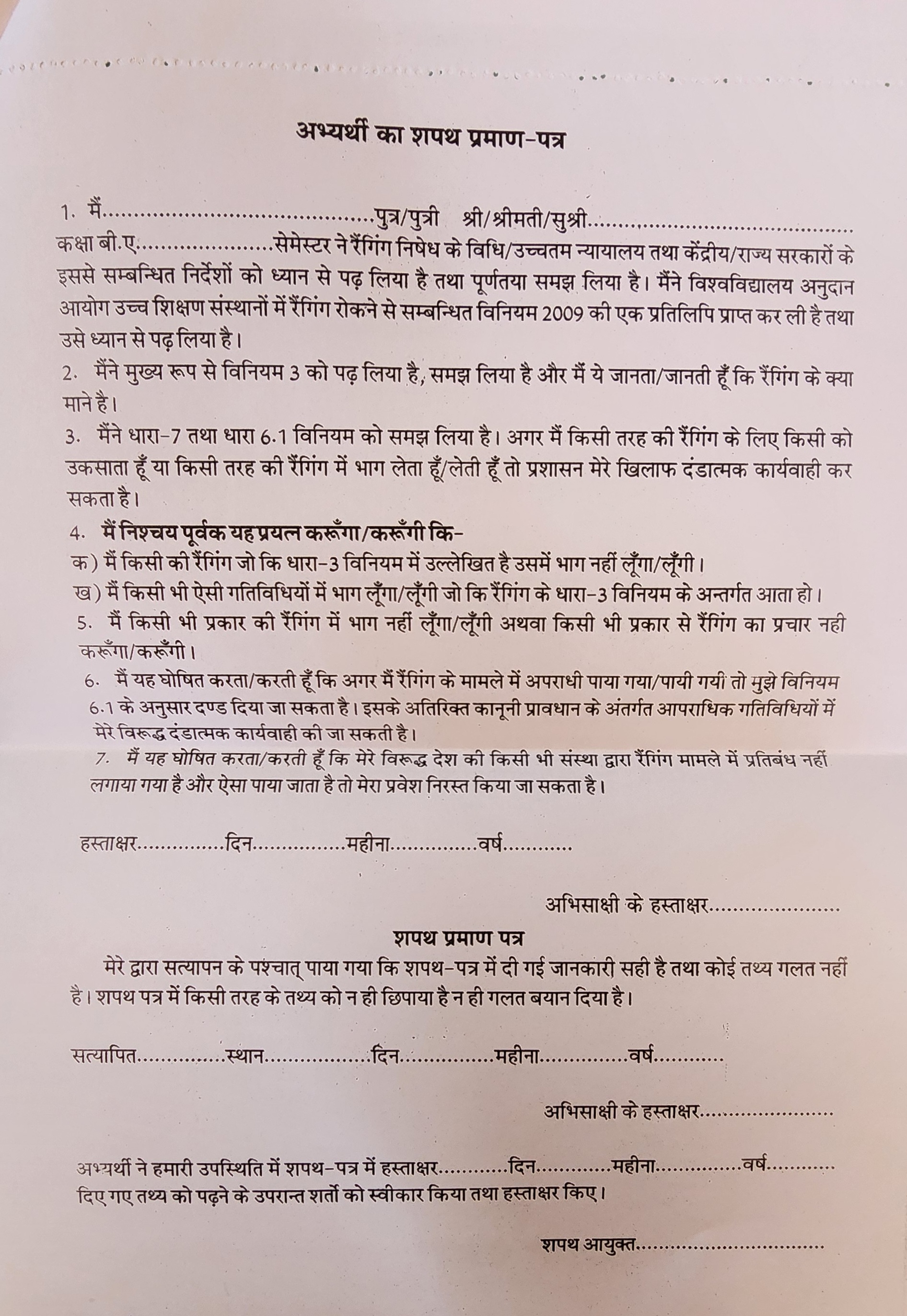 The Hon'ble Supreme Court of India has issued very strict instructions to curb the menace of ragging in institutions and has passed an order in May 2007 in which ragging has been declared a punishable offence and anyone indulging in ragging shall be strictly punished immediately. Any student violating instructions of the Supreme Court shall be immediately punished by the institution and FIR will be lodged against the person involved. An undertaking is to be filled up and signed by the candidate to the effect that he/she is aware of the institutions approach towards ragging and of the punishment to which he or she shall be liable if found guilty of ragging. A similar undertaking shall be obtained from the parents/ guardian of the student. The undertaking/affidavit can be obtained by the student himself/herself (free of cost) by filling the anti-ragging form on the UGC webpage: https://antiragging.in/affidavit_affiliated_form.php